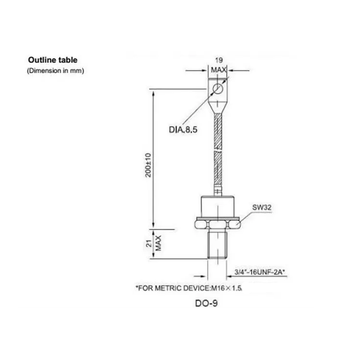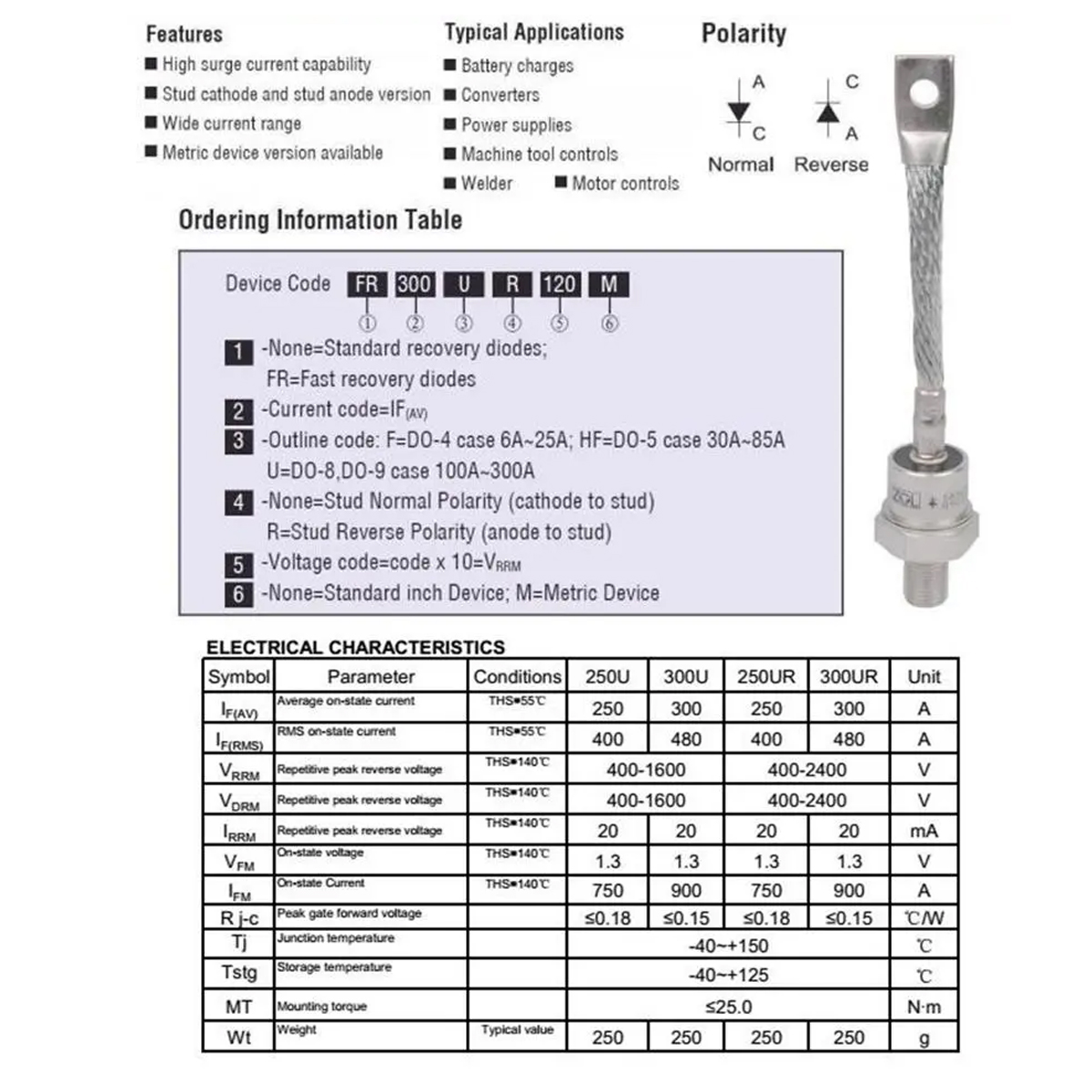 (KIT-250U120-R) Diodo Rectificador 250A 1200V Anodo y Catodo (M16x1.5) 250U120 250UR120