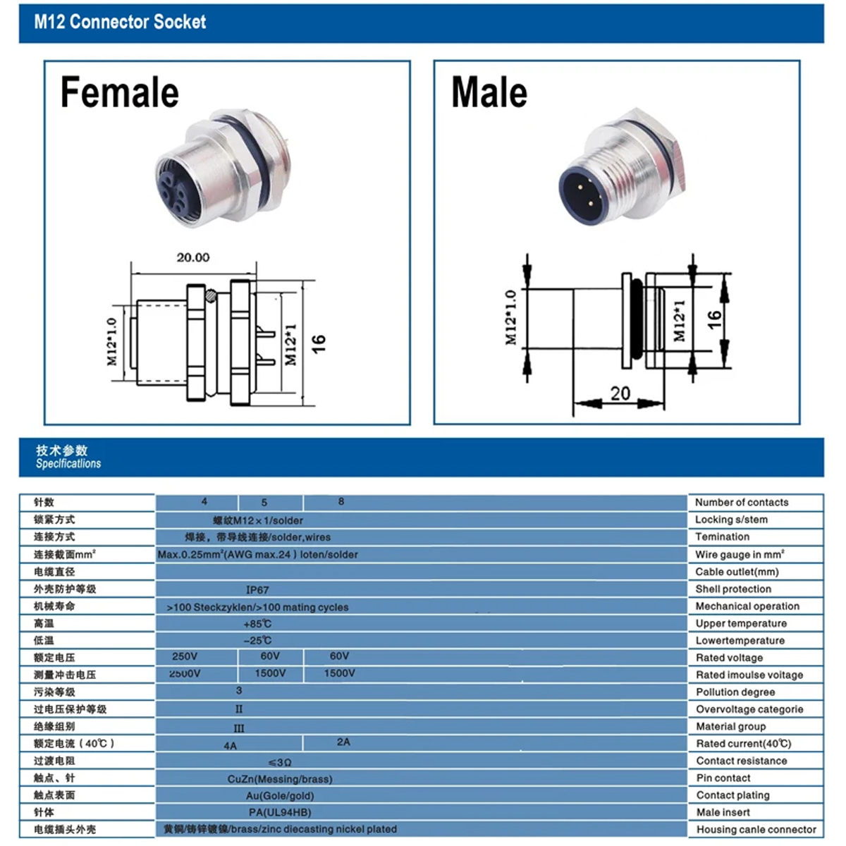 (M12-CH-M-5) Conector M12 Macho 5 Polos 5 Vias 5 Pines Para Chasis Gabinete
