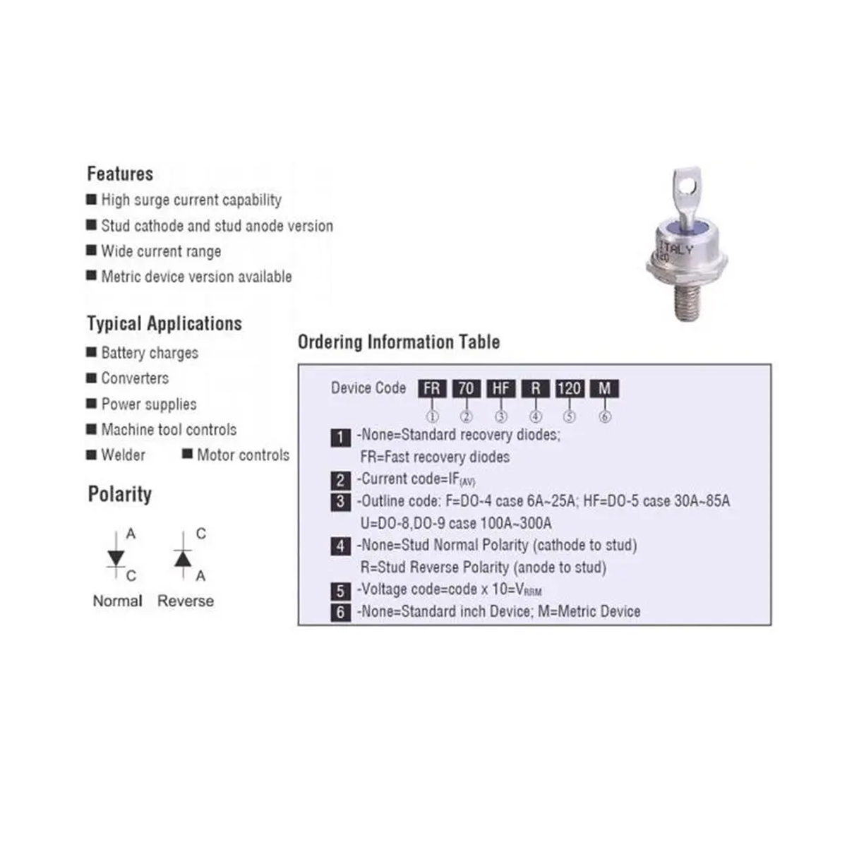 (KIT-80HF120-R) Diodo Rectificador 80A 1200V Anodo y Catodo (M8x1.25) 80HF120 80HFR120