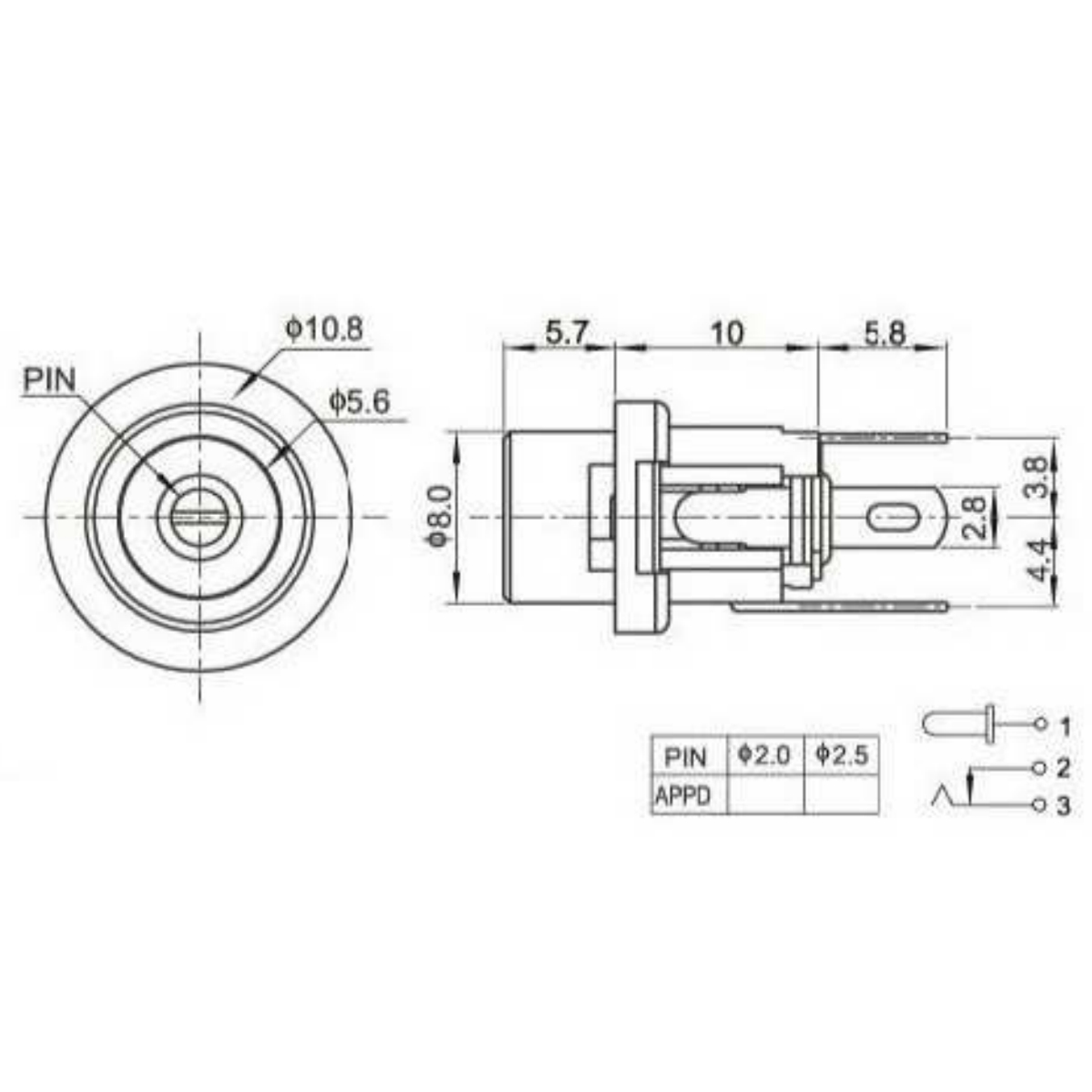 (JK-DC025-CH) Conector Jack DC Hueco 2.5mm Para CHASIS Con Corte