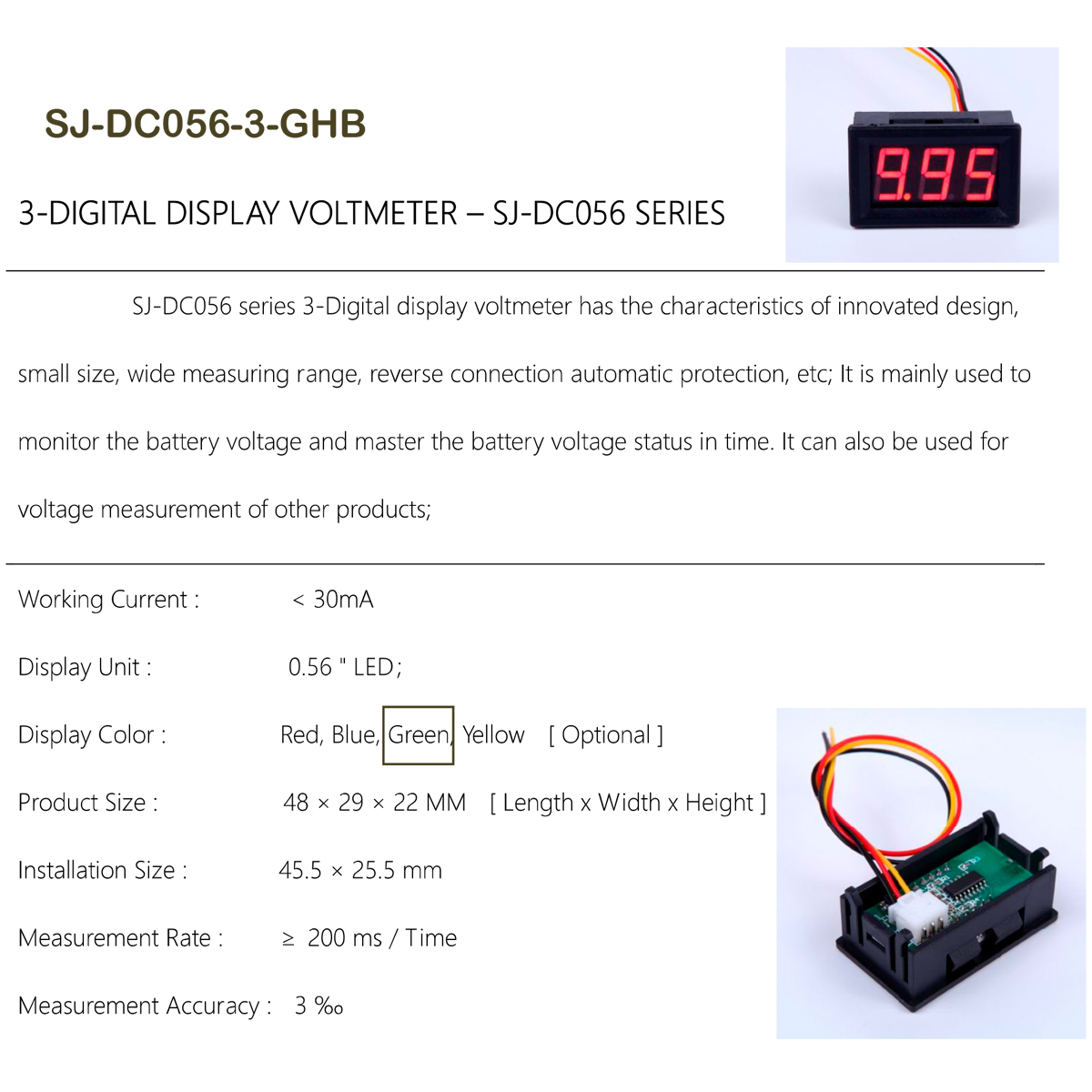 (SJ-DC056-3-GHB) Voltimetro PANEL 3 Digitos LED 0.56" Verde 3 Cables 0-30V