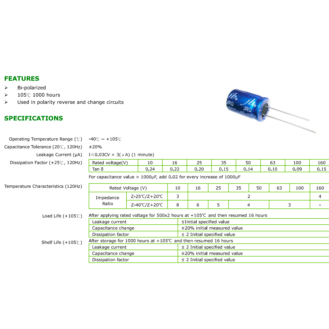 4.7x50NR Los capacitores marca JB Capacitors Bipolares (No Polarizados) modelo JB JRQ tienen encapsulado con marca de Negativo siendo BIPOLARES.
