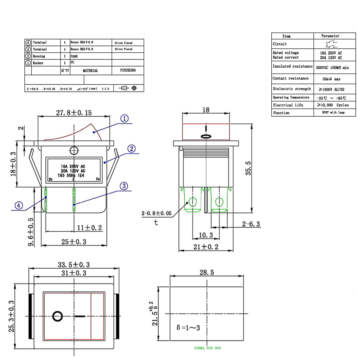 (LT345) PULSADOR TECLA 2 Polos 15A 250V LUZ ROJA 31x25mm (28.5x21mm)