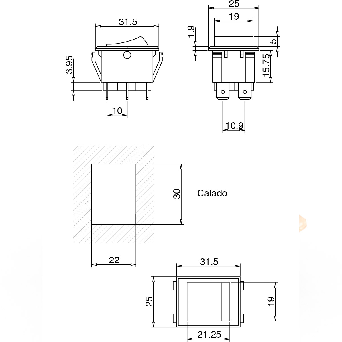 (LT3125-NN) TECLA 2 Polos 10A 250V ON-OFF (0-I) 31.5x25mm (Calado 30x22mm) DPST