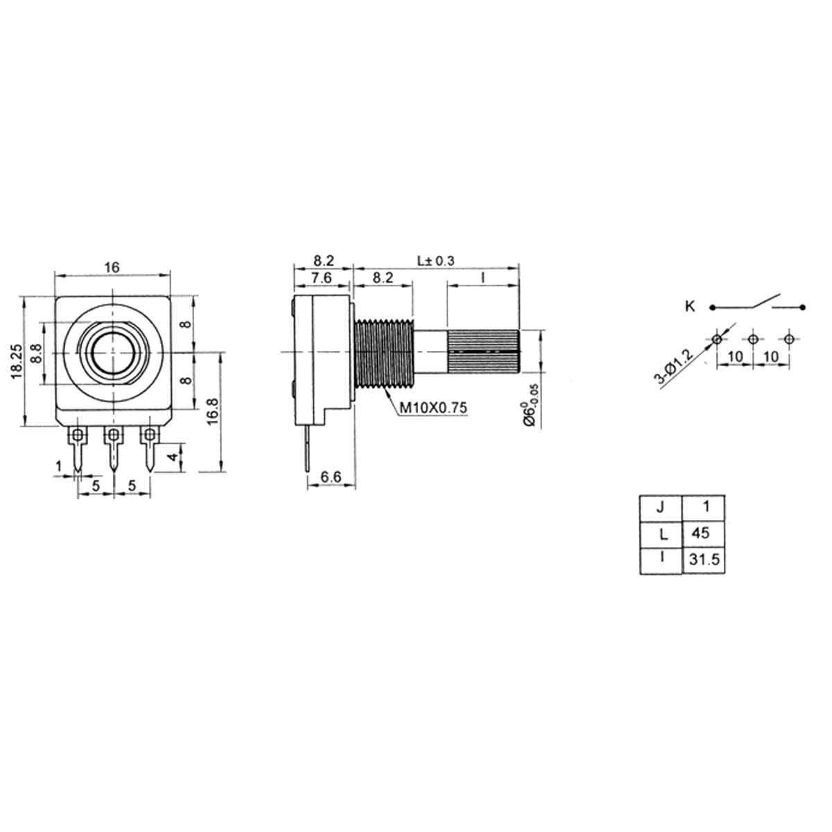 (WH0162-50K) Potenciometro Lineal 50K (B) Eje Plastico Estriado 6mm 45mm Largo
